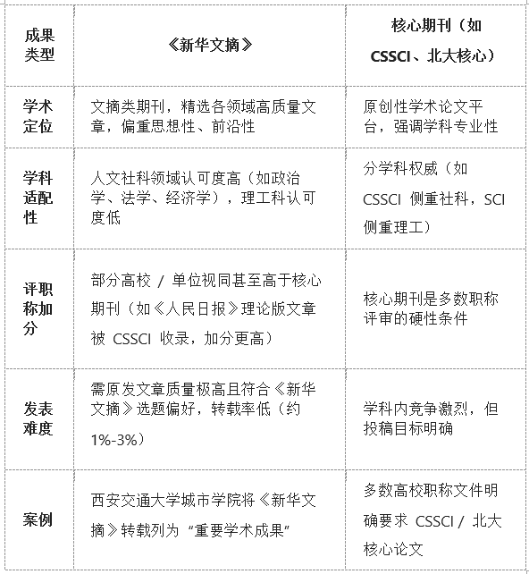部分单位明确将《新华文摘》转载列为评职称的 “硬性条件”。例如:在人文社科领域,转载文章可能等同于甚至高于普通核心期刊(如《人民日报》理论版文章加分高于南大核心)。